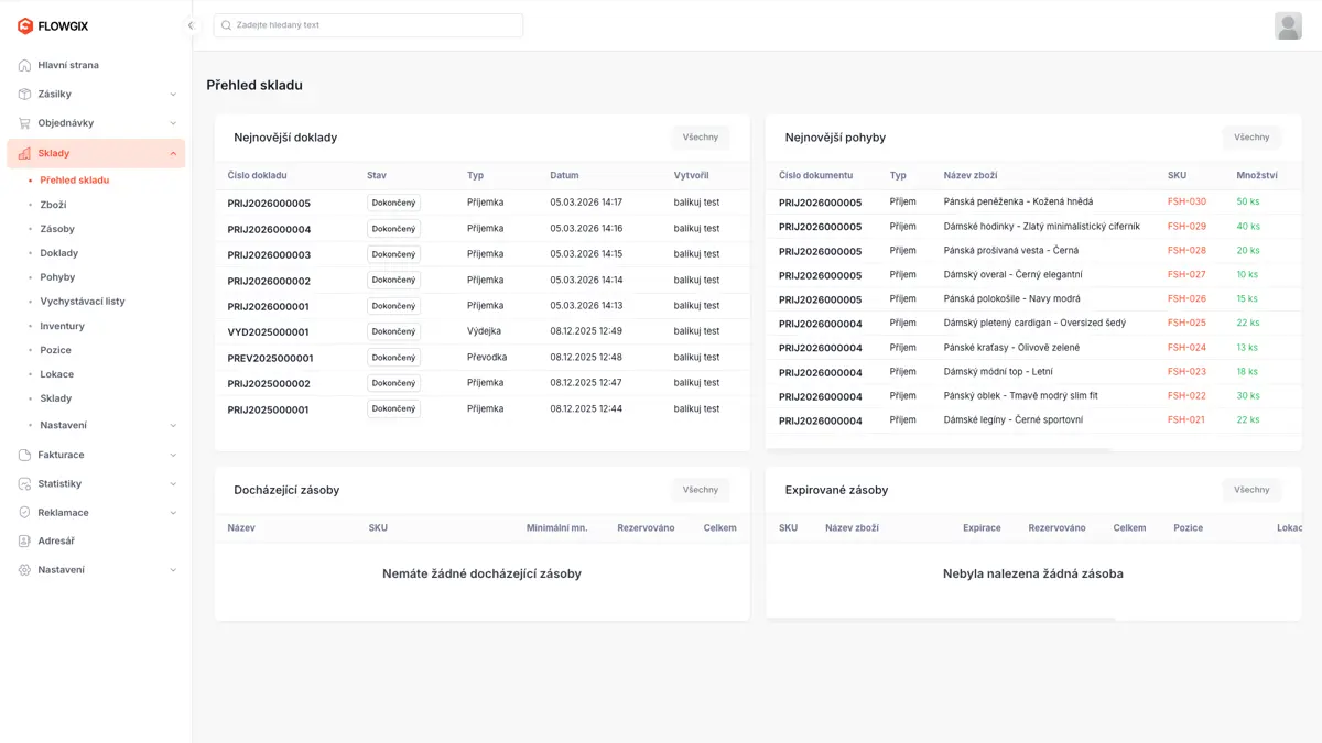 Flowgix WMS propojuje všechny klíčové části provozu e-shopu - od příjmu zboží na sklad přes zpracování objednávek až po expedici a fakturaci. Systém funguje jako jeden celek: zásoby se synchronizují automaticky, objednávky se načítají z e-shopu, štítky se tisknou jedním klikem a faktury se párují s platbami.