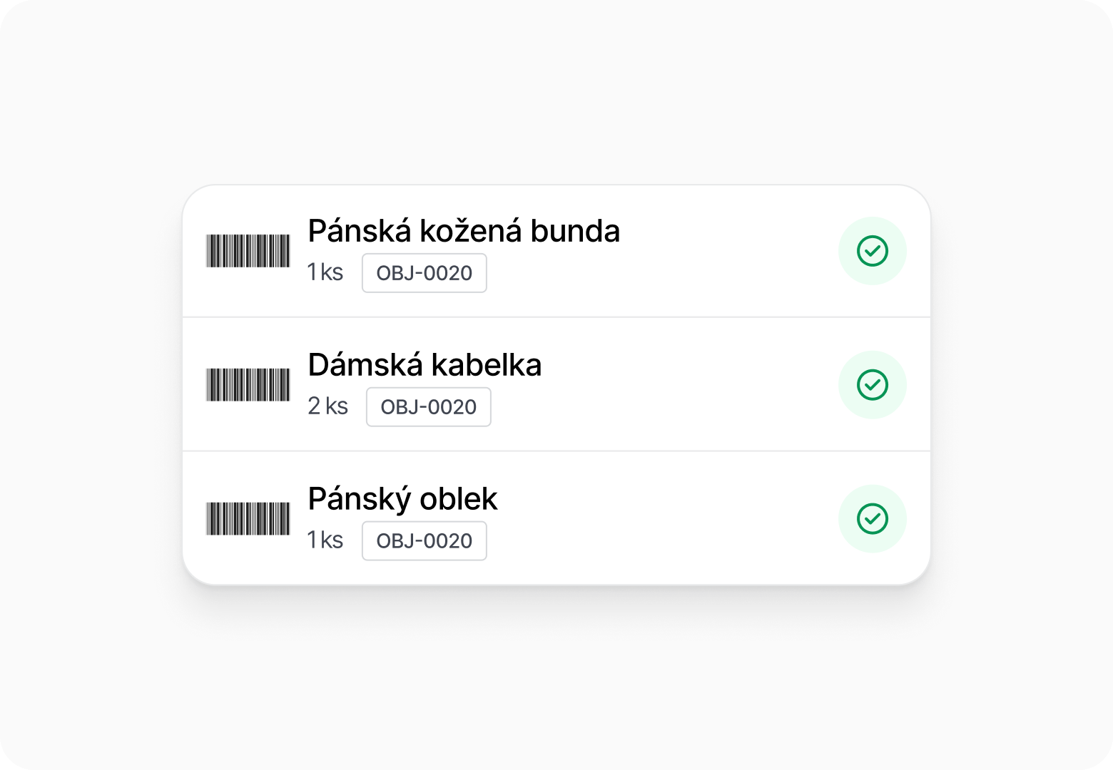 Kontrola položek, množství a čárových kódů.