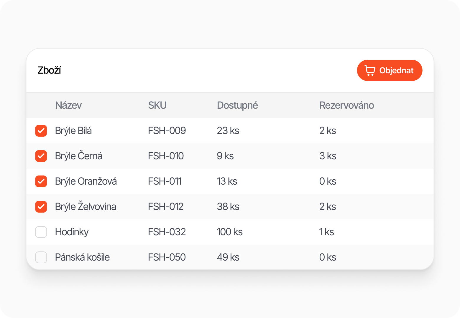 Je to jednoduché – vyfiltrujete si zboží, které chcete objednat, doplníte požadované množství, Flowgix automaticky vytvoří objednávku a kliknutím na jedno tlačítko ji odešlete dodavateli.